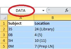 The next step was to select which area of the spreadsheet I wanted imported into Outlook. This involved highlighting all of the cells that contained data (including the column headings) and naming this range. The easiest way to do this was to enter it into the box next to the left of the formula bar.