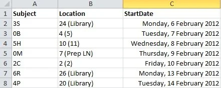 I created a separate worksheet for each of the times I teach (9am, 10am, 11:30am, 12:30pm, 2:15pm)I entered all of the classes that I taught at that time over the 7 day cycle (eg: Day 1 at 9am, Day 2 at 9am, Day 3 at 9am etc..) with the class being in the subject column and the room being in location.Not wanting to enter each date individually, a google search found a formula that produced what I needed.